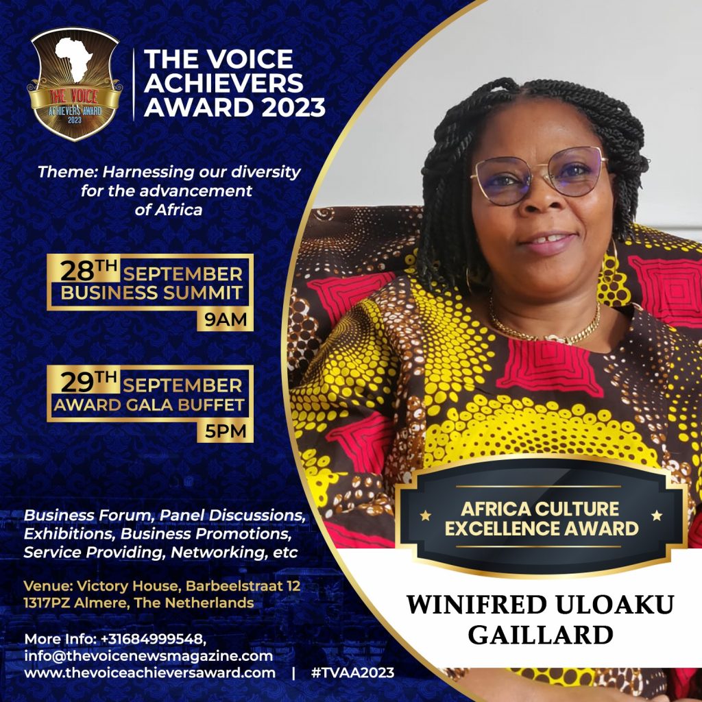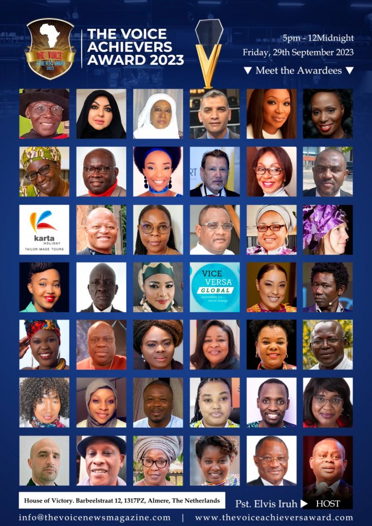 The Editorial Board of The Voice magazine (the first and biggest African news Magazine published in the Netherlands) constituted an Award Committee that under strict but objective appraisal; nominate distinguished Africans and friends of Africa, worthy of appreciation and Honour at every forthcoming “The Voice Achievers Award”. Its goal is to be an annual event to encourage Africans and friends of Africa in various fields of human endeavours to do more and attain an outstanding status. We are in no way saying these people we have chosen are the best but they do have outstanding qualities that we are proud to present to the world. The award is designed to serve to mentor people to aspire for excellence in all facets of human activities. It is a mixture of young and older minds being rewarded on the same platform.It is unique because it offers not only recognition per excellence to the winners but also create an opportunity to meet other professionals and entrepreneurs from other communities in an interactive atmosphere to exchange new ideas. For more information, please visit Voice Achievers Award.